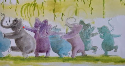 Donderdag 23 april is om 17.00u de afsluiting van de AMV lessen. De kinderen zingen en spelen een verhaal met muziek: 10 olifanten op weg naar een dansfeest!